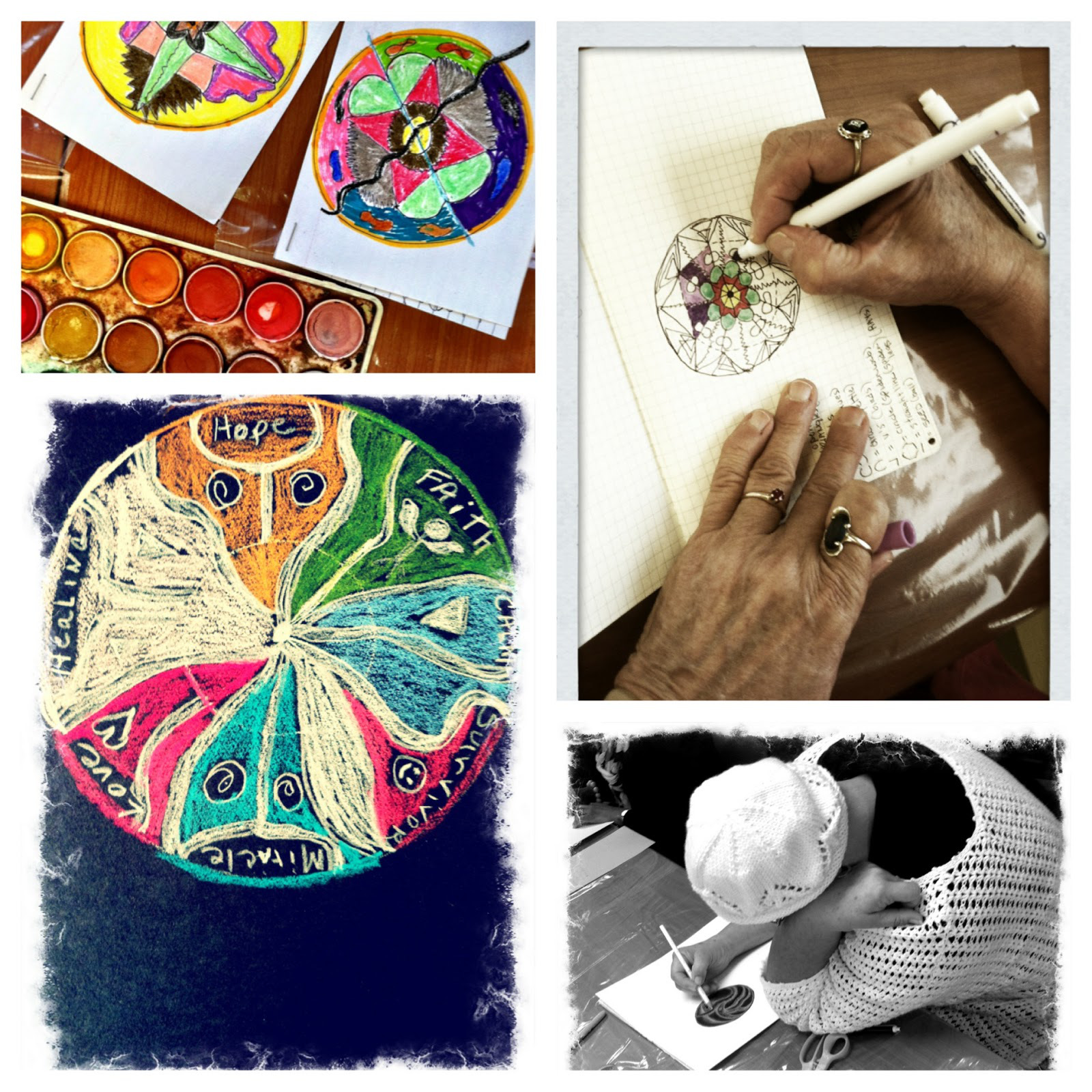 The mandalas we create begin prayerfully with the theme of hope and healing. Quieting our minds, we open ourselves to the creative process, providing the space for our inner voice to speak. Our classes always begin with the creation of an Intuitive Mandala. Working within this shape allows us to experience feelings of calm, tranquility and peace. These two previous posts will explain more about these stress relieving practices: Calming Practices: Creating Mandalasand Tranquility Practice: Creating Radiant Mandalas. The mandalas created in our healing practices are visual testaments to the wisdom gleaned through the cancer journey. I am thankful for the inspiration that the Tibetan mandalas have given me.