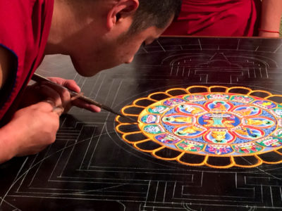 My thaw began slowly in November when two Tibetan Buddhist Monks came to Columbia to create a Sand Mandala for Healing Icons 20th Anniversary. Witnessing this incredibly patient and intricate process made me realize I simply needed more uninterrupted studio time. My hummingbird approach to making art was just not working. I needed larger chunks of devoted time. I also fell in love with what they created. The sand mandala of healing was full of vibrant colored, patterned symbols that literally pulsated with energy. I wanted my art work to have that same life force.