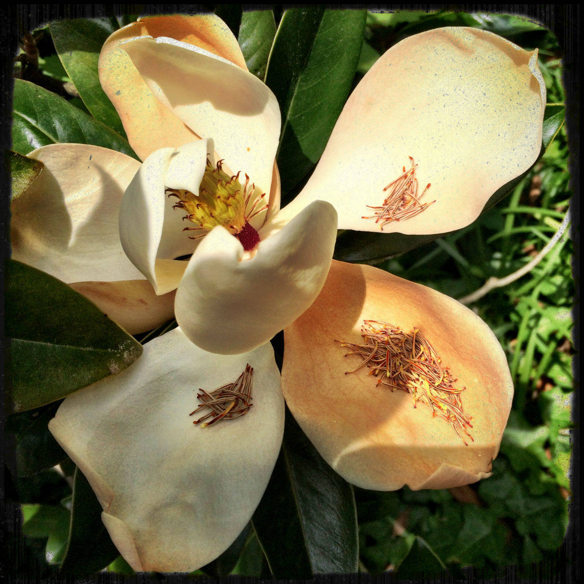 The magnolia blossoms of ivory white formed the final outer seal of protection. As I pulled the individual petals from the blossom, their shape reminded me of a cupped hand waiting to receive. Its dense, sweet aroma entered through all of my senses, and a nearly palpable guiding energy led my hand to the remaining items in my gathering pile. Intuitively, I broke and tore the rest of my collectings into pieces, chanting all the thoughts and emotions that came to mind – putting them to rest within my creation, honoring them, seeing them, recognizing them, and then letting them go.