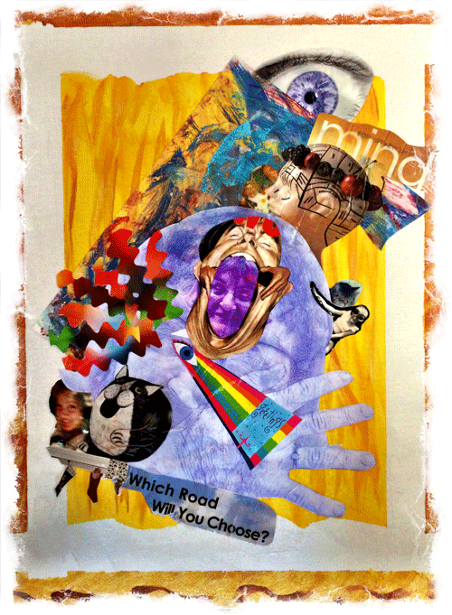 In our Healing Icons classes, we create collages from images we intuitively and spontaneously cut out of magazines and catalogs. When we assemble these seemingly disparate parts and pieces into a whole, they paint a picture for us, a waking dream, a different kind of self-portrait. If we question our creations honestly, they hold layers of revealing, exciting information for us. From the symbols within our collages, we make spirited, spur-of-the-moment word associations and link them together in a free-writing style of poetry. Listening with the eyes and ears of the heart, our visual creations become not only our own personal teachers but also teachers for the cancer community at large.Self-Portraits & Written Reflections