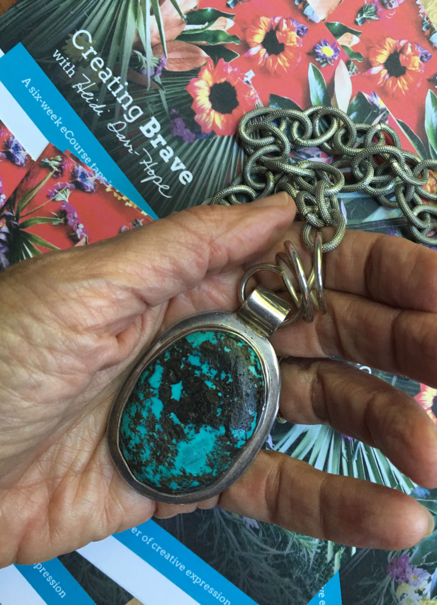 My Carol Talisman to fight off my annoying impostor voice.I have several pieces of jewelry that I have assigned different attributes. My "powerful strength" totem is a turquoise pendant that belonged to a dear friend of mine. She died of cancer after a fierce battle over a decade ago. Her husband could not bear clearing out her belongings, so he invited her closest pals to. We gathered, told stories and remembered Carol, all leaving with a few things that held her energy. When I chose this pendant, along with her well-worn horse-riding cowboy boots, I had no idea how much I would cherish these totems.