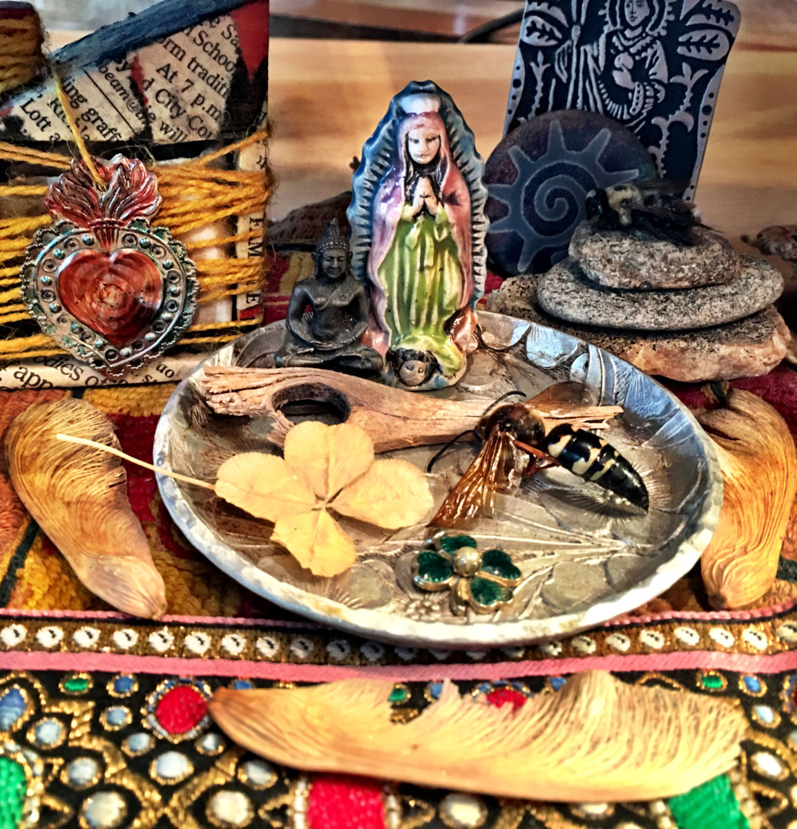 A hammered metal coaster is my collection plate for the things I find. It rests on my desk. A small ceramic Virgin of Guadalupe that I stumbled upon in Peru sits on this coaster alongside a tiny metal meditating Buddha that I picked up in World Market. They welcome my found objects and provide a holding space for them until I have discovered the story they are telling.