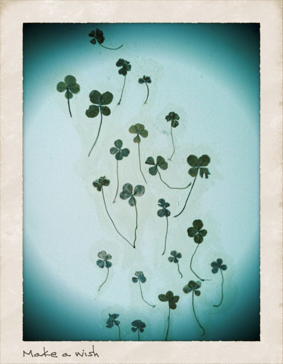 Reconnecting with that joyous feeling of discovering these hidden treasures does wonders for my well-being. I was reminded of this a couple of years ago when my daughter was getting married to a wonderful young man whose family lives in Philadelphia. My husband and I had traveled up for a weekend of festivities, and the last thing I expected to reconnect with was my love for four-leaf clovers. There in our bedroom, collaged directly on the wall, were dozens of these good luck totems! When I asked Steve (my son-in-law) about it, he casually remarked that his sister, Meagan, did "it" during high school. Well, I thought this was super cool on so many levels. One, that their parents Vicki and Tony were okay with creating art directly on the walls; and secondly, that four-leaf clovers graced this teenager's room instead of pop culture icons. This elegantly simple, playful statement was amulet-making in its purest form.